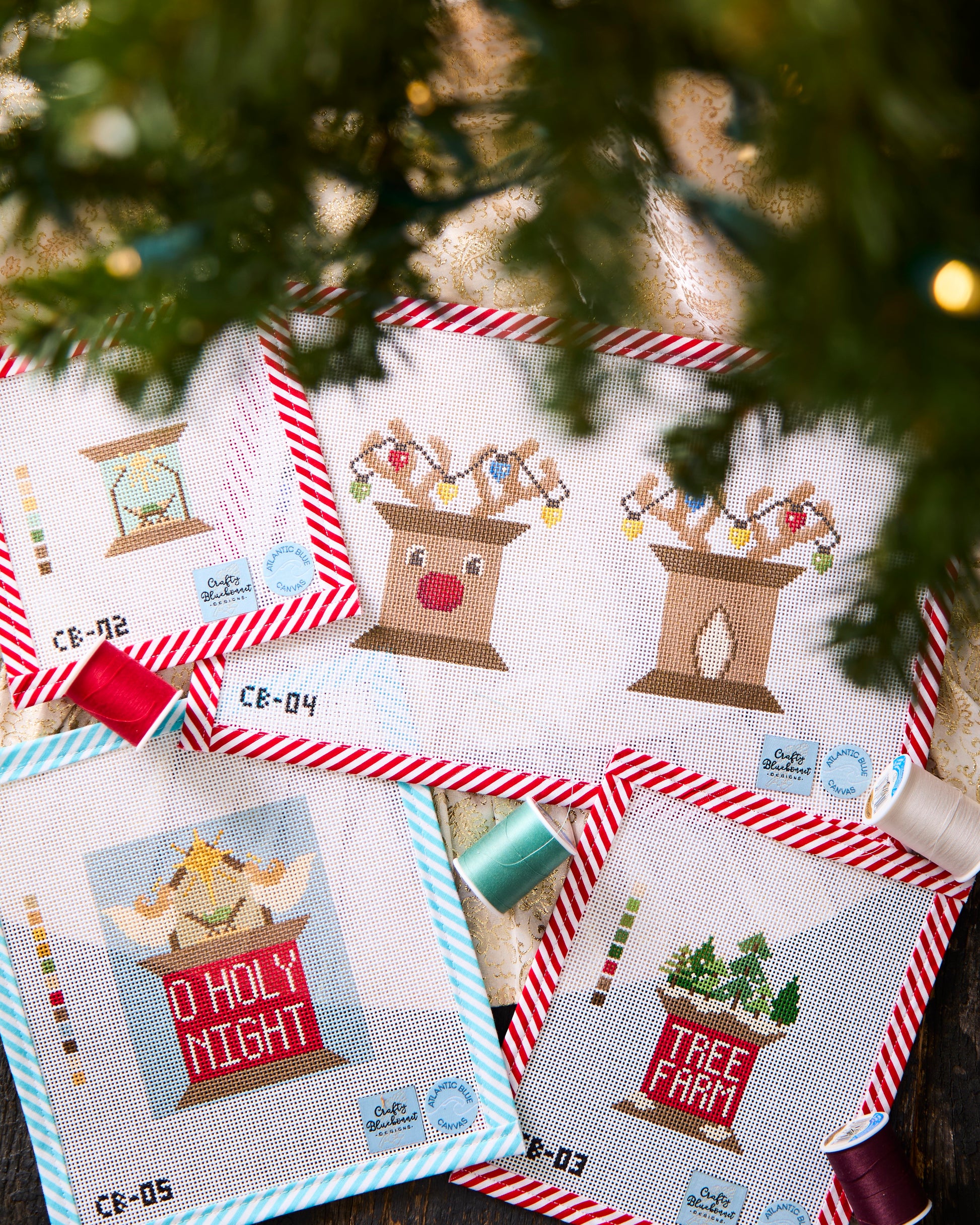 Bring rustic holiday charm to your home with this delightful needlepoint pattern! Featuring a cozy evergreen arrangement nestled atop a vintage spool marked with the words 'TREE FARM' in classic red and white, this design captures the nostalgic spirit of Christmas tree hunting and cherished winter traditions. Original design by Crafty Bluebonnet Designs.